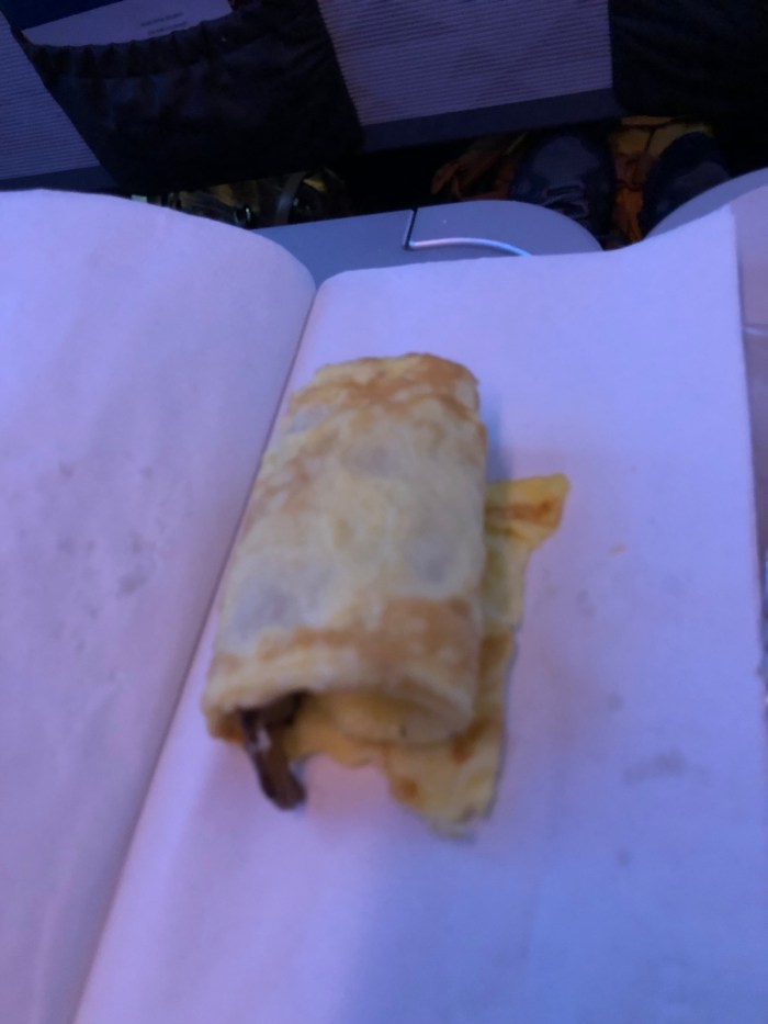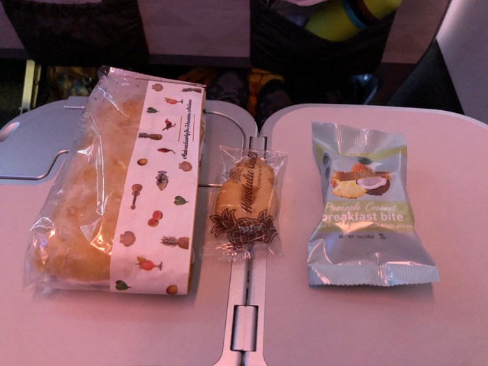 Hawaiian Airlines is the only airline that serves a meal free of charge. Egg, cheese and mushroom sandwich, pineapple/coconut bar and a Honolulu cookie. Two of the three were full of gluten so I rolled up the egg and mushrooms, ate the bar and I will save the cookie for later when I am not stuck on an airplane full of people. I would rather not use the restroom…I may have to later but for now I’m okay.