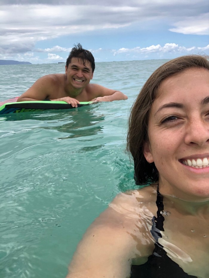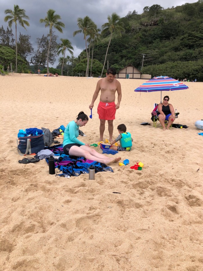 Waimea Bay Beach Park. We got to use the boogie board. The waves were crashing hard and the surf would suck you back out. All of my pockets in my shorts and swimsuit were full of sand lol.