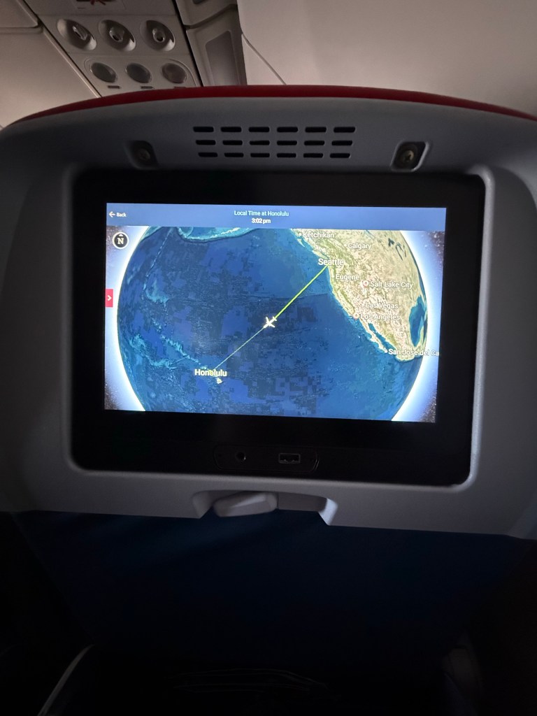 Both flights were relatively uneventful.  Eugene to Seattle was quick. Seattle to Honolulu was perfect.  Well except for when I was boarding.  First, the flight attendant saw my duffle bag and backpack and said I needed to put one in the overhead compartment.  I told him that it was just my pillow lol. He waited to watch me pull my pillow out and then left me alone.  I always book a window seat on the right side of the airplane.  Don’t ask me why, I just do.  A guy  who was boarding late said, “I think you’re in my seat”? Me? I have been waiting all my traveling life to be confronted over a seat so I confidently pulled out my phone and brought up my boarding pass.  It said 11A.  He said,”that’s over on the other side”.  I wanted to crawl under my seat and die because the two other passengers were already settled in and they would have to get up for me to move.  The guy was nice though and he just switched me seats lol. So lesson learned.  Read the letters above the seats πŸ˜‚