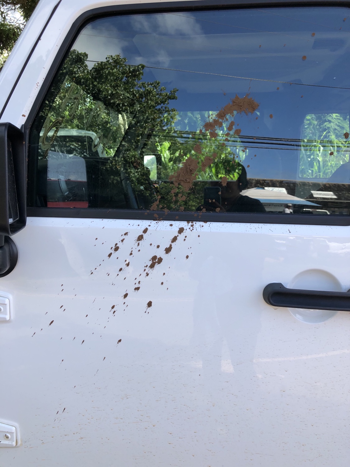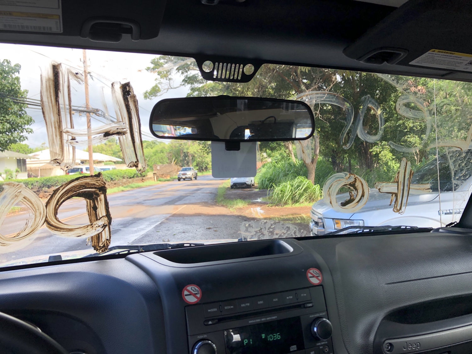 We returned to Poipu around 10:30am. When we drove by my Jeep someone had written on it with mud….and threw mud on the door.